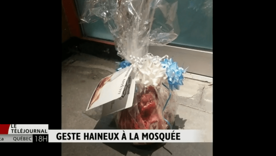 Quatre mois plus tard, à 2:10 a.m., fut retrouvée une tête de cochon à la Grande Mosquée de Québec, dans un emballage cadeau orné de divers «choux» de couleur et une petite carte souhaitant «bon appétit» :